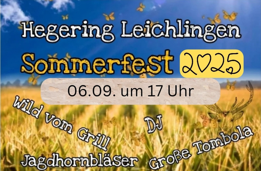 Am 06.09.2025 ab 17 Uhr, findet auf dem Landwirtschaftsbetriebes Meuthen, Oberschmitte 19 in Leichlingen das diesjährige Sommerfest statt. Bei Wild vom Grill, kühlen Getränken und dem Besuch der Jagdhornbläser, freuen wir uns auf ein paar schöne, gemeinsame Stunden. Selbstverständlich wird auch in diesem Jahr die beliebte Tombola nicht fehlen.
